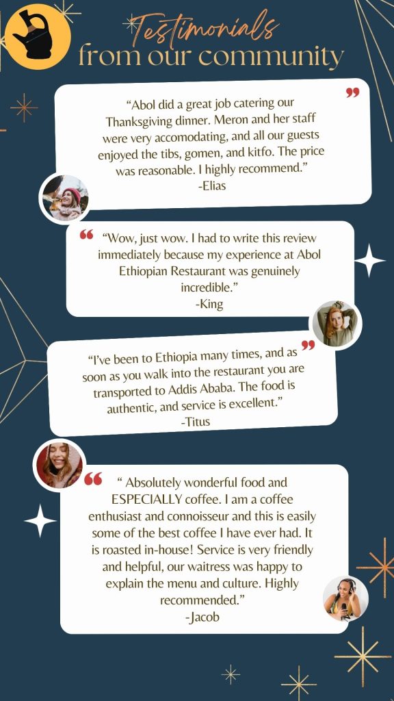 Abol Restaurant is a warm and inviting dining destination that celebrates the rich flavors and traditions of Ethiopian cuisine. With a commitment to authenticity, we offer a carefully curated menu featuring classic dishes like injera, doro wat, and kitfo, prepared with fresh, high-quality ingredients and traditional cooking techniques. Our cozy ambiance, infused with Ethiopian cultural elements, provides a welcoming space for families, friends, and food lovers to gather and experience the true essence of Ethiopian hospitality. At Abol, every meal is more than just food—it’s a journey into Ethiopia’s vibrant culinary heritage.